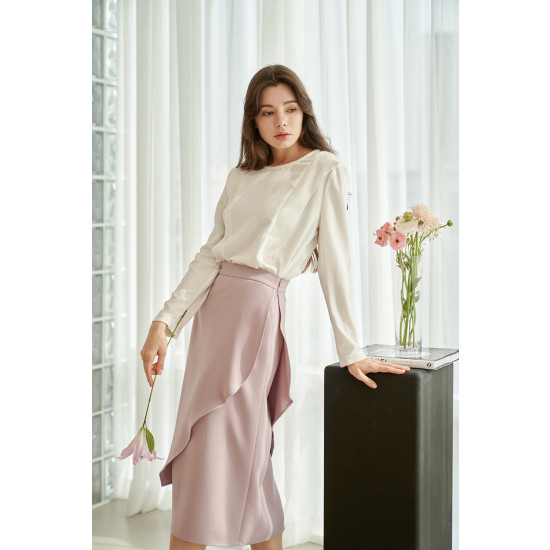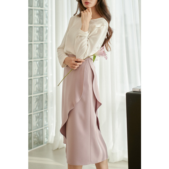 러플 디테일이 가미된 언밸런스드 랩스커트입니다.